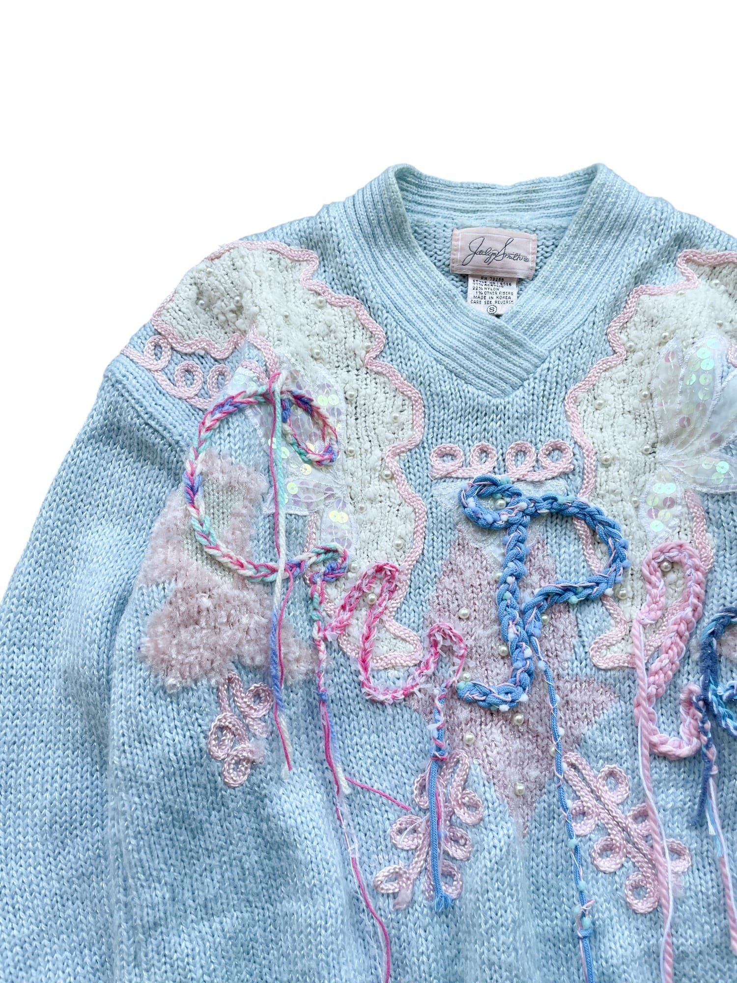 モチーフとビーズが散りばめられたアクリルニットに鎖編みの文字を縫い付け、装飾を加えました。