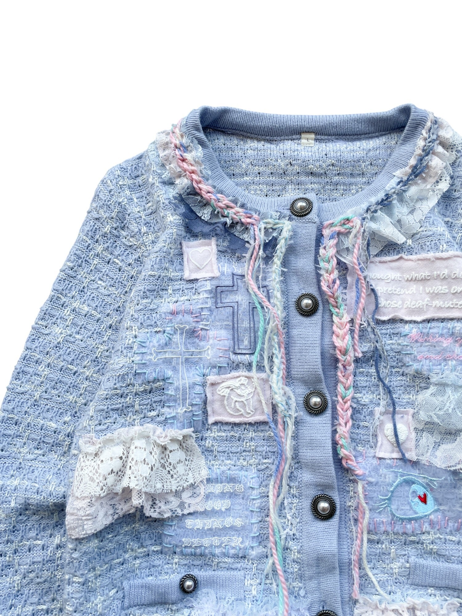 扱いやすいアクリルニットにフリル、鎖編み、プリント、刺繍のモチーフを縫い付けました。