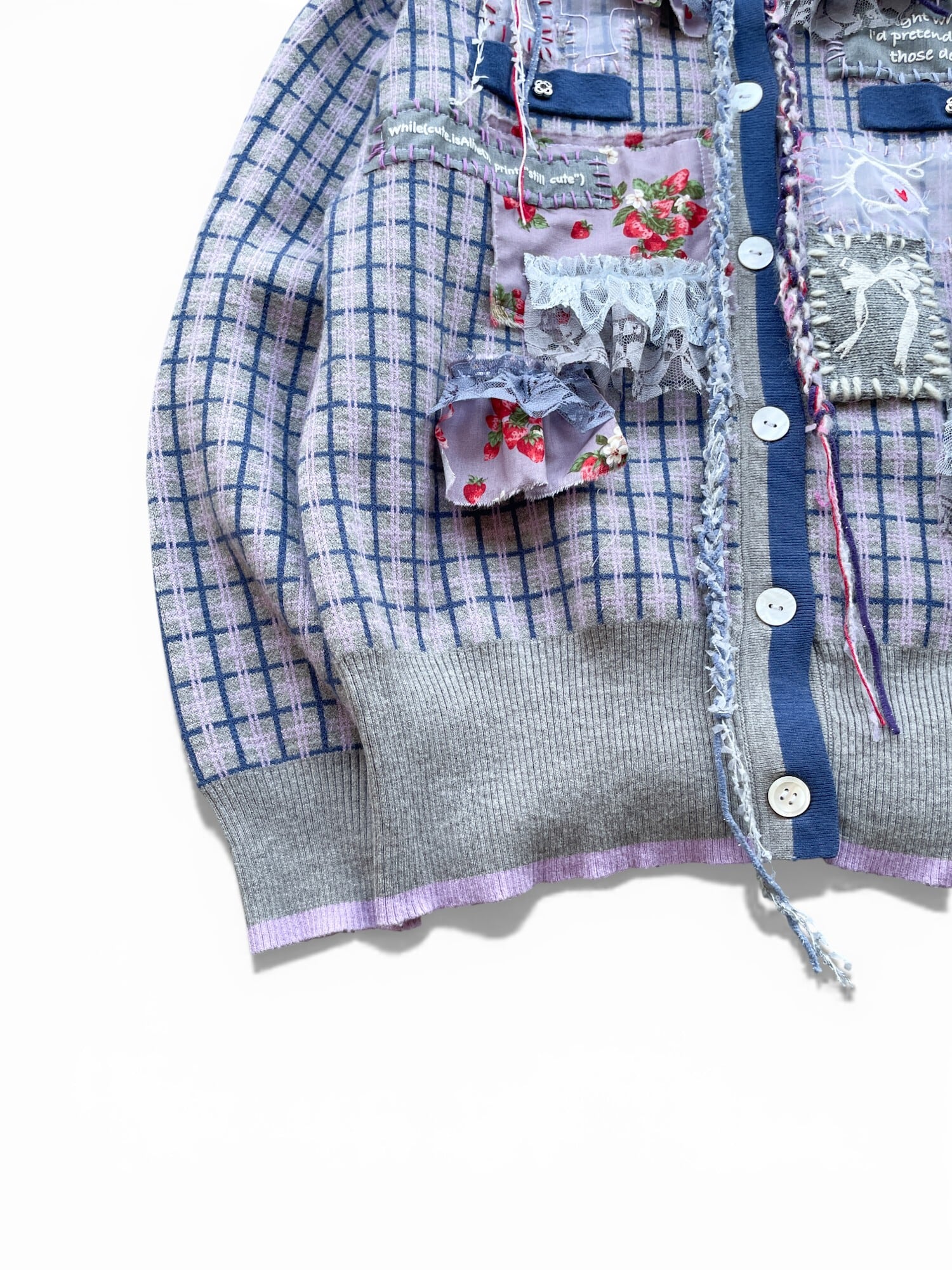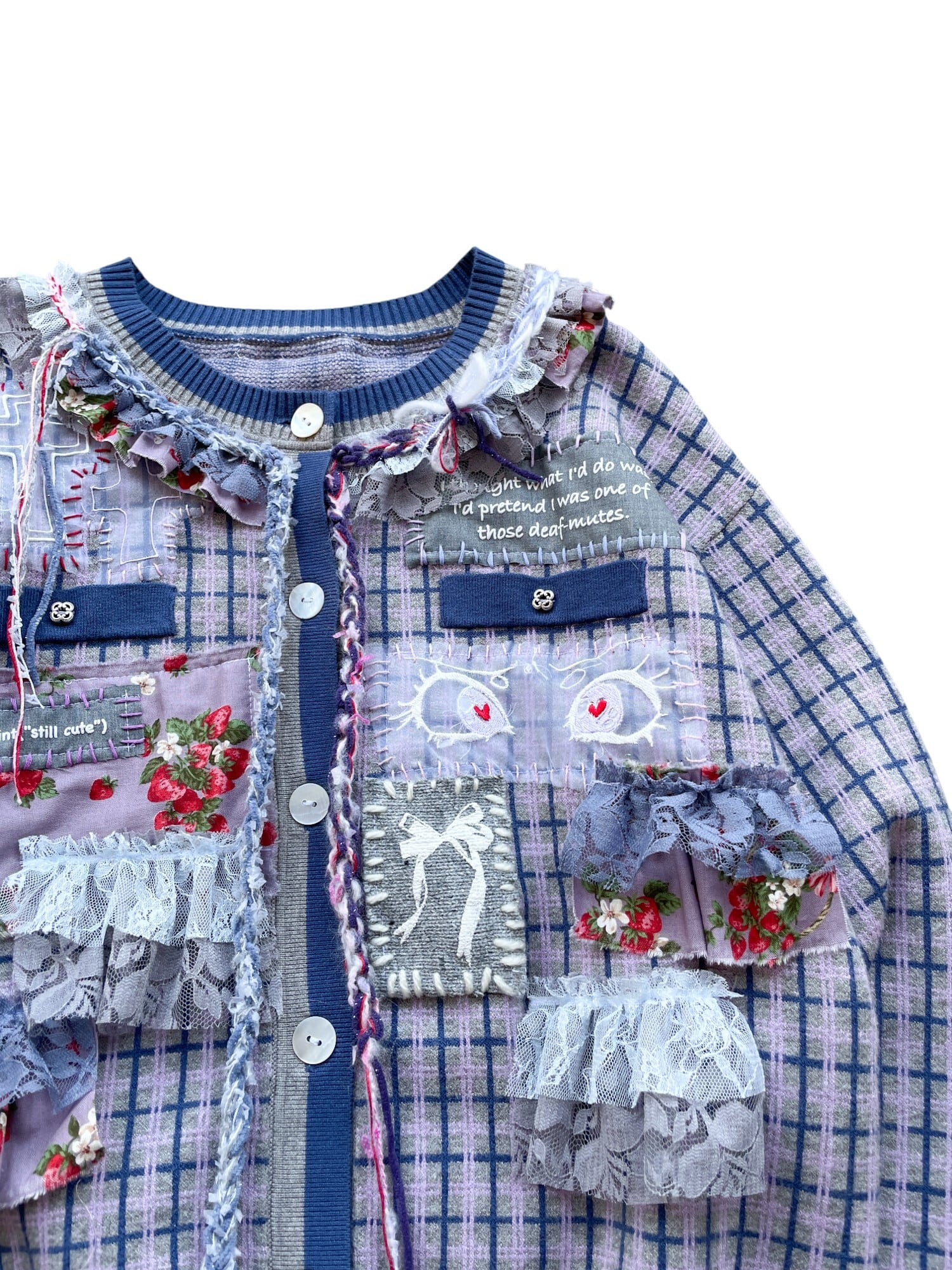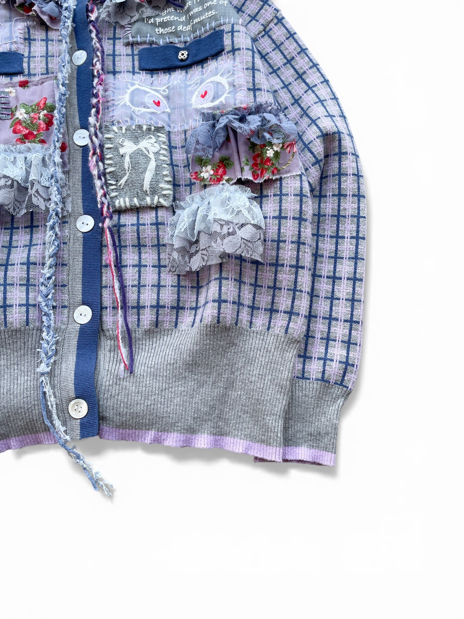 扱いやすい化繊の混紡ニットにフリル、鎖編み、プリント、刺繍のモチーフを縫い付けました。