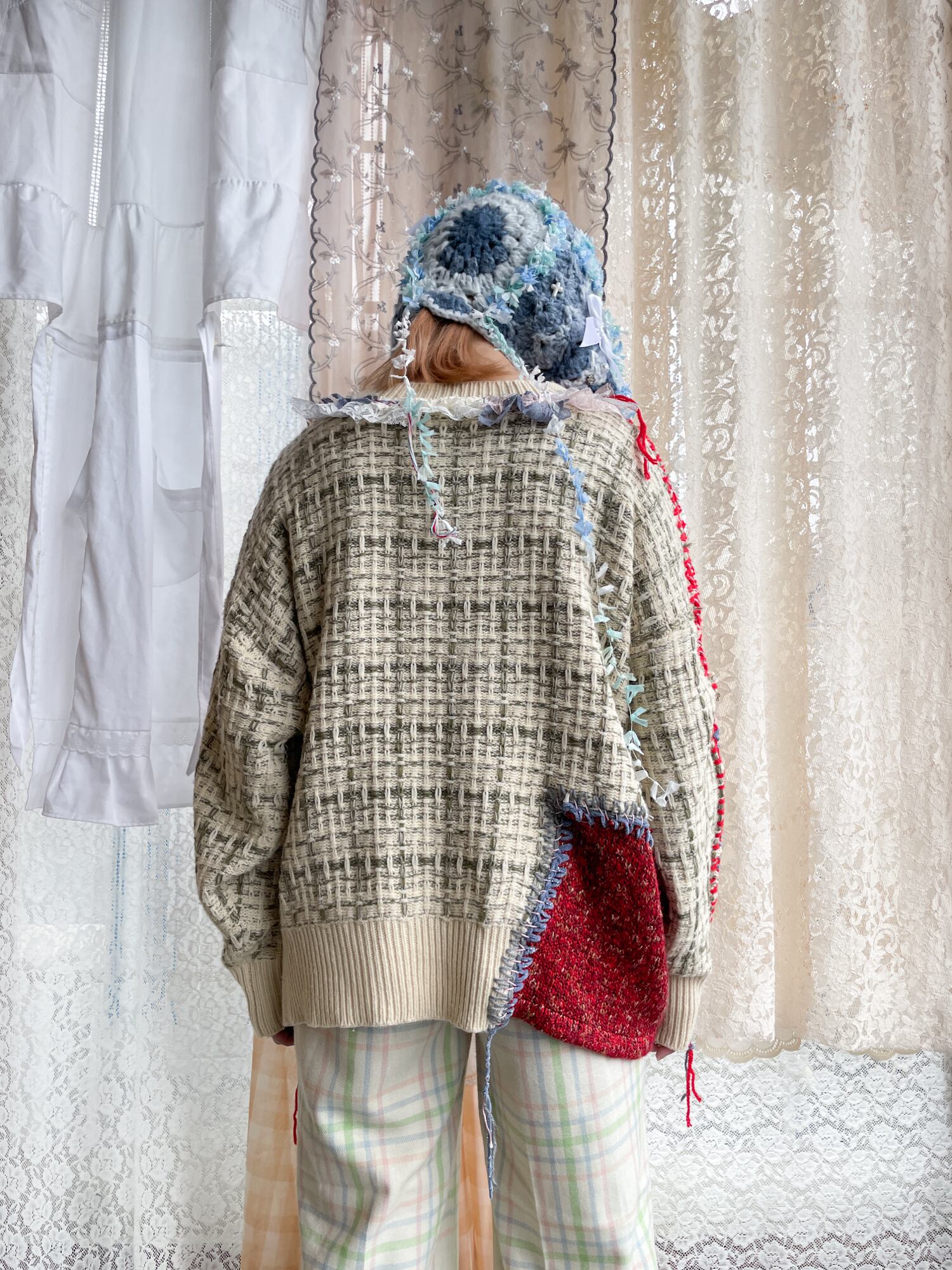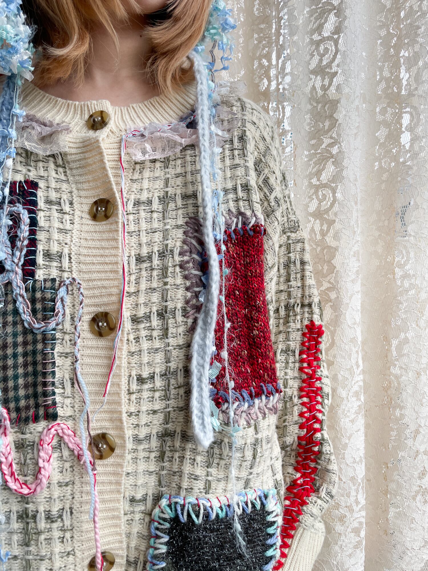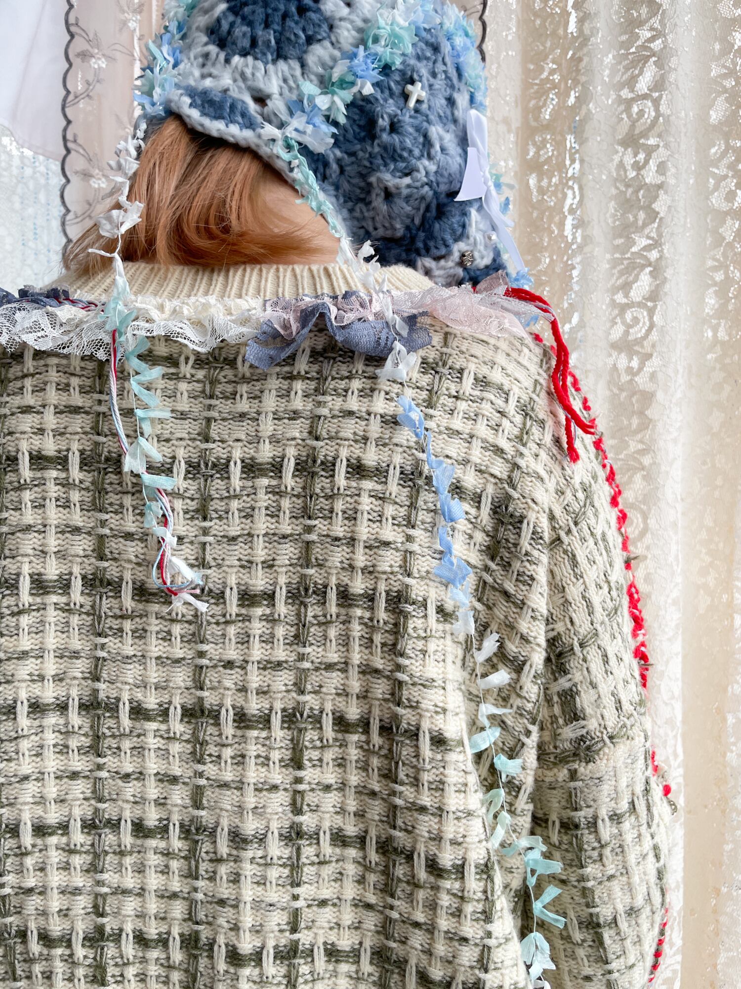 アクリルニットカーディガンに手編みの切り替えと鎖編みの文字を装飾しました。