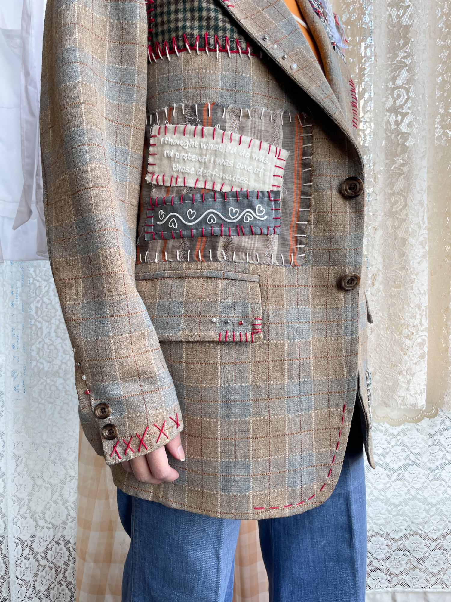 上質な半裏ウールジャケットにパッチ、プリント生地、ビーズを全て手縫いで縫い付けました。