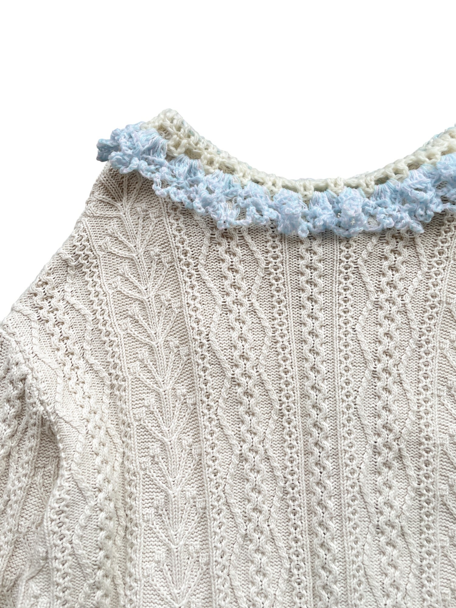 カーディガンの前縦と衿のリブを編み地に交換し、フリルとプリントで装飾しました。