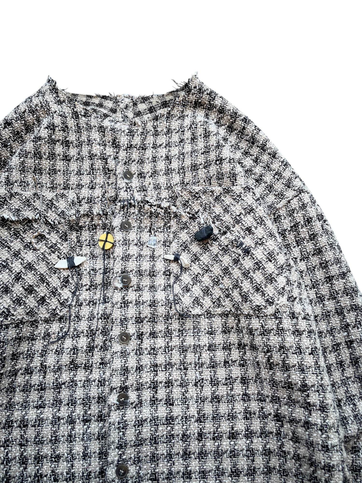 手作りのチャームは砂浜に流れ着いた材料を使っています、服と共に進んでいく経年劣化をお楽しみください。