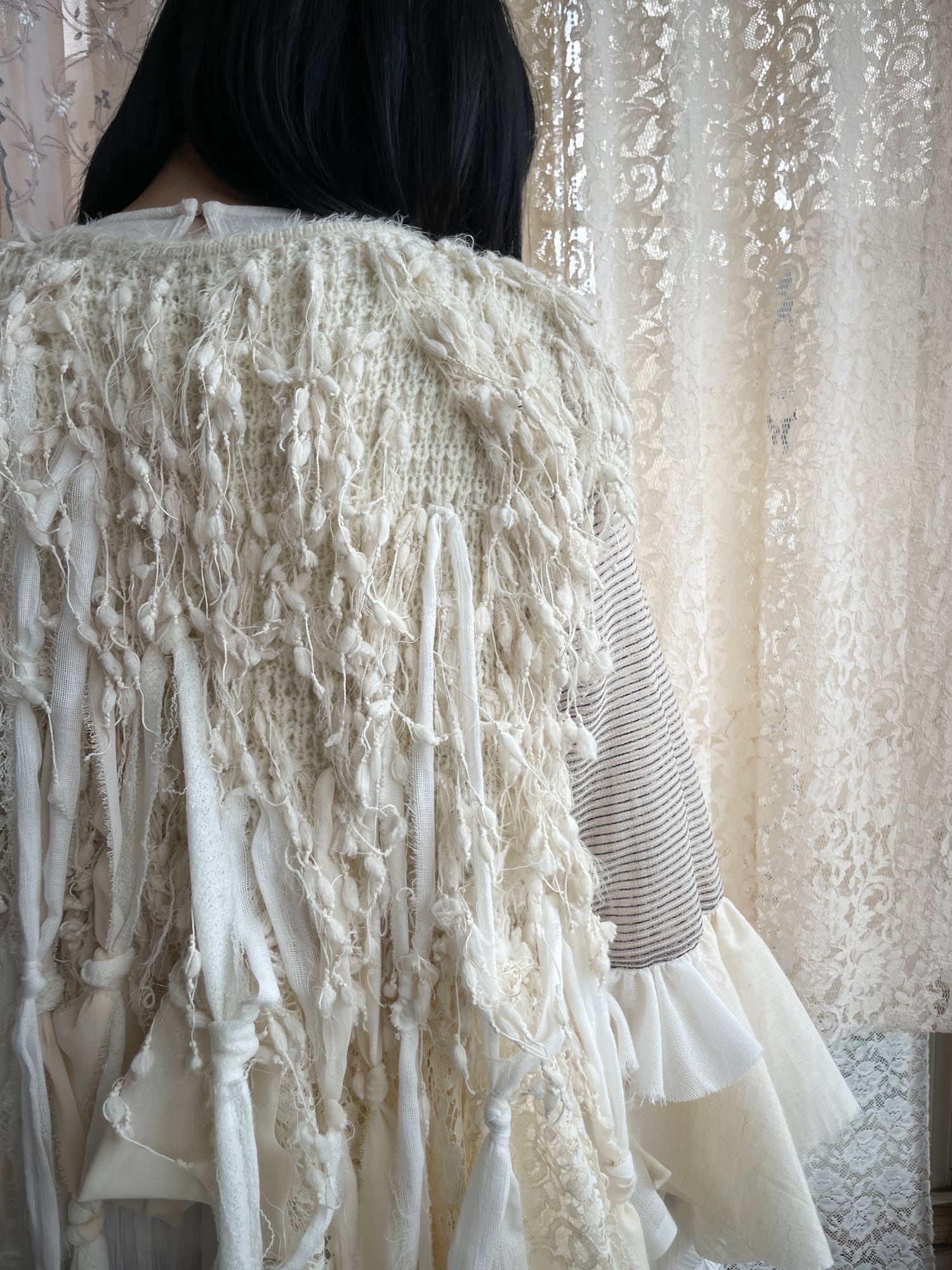 フリンジニットにグランジ要素を詰め込んだアートピースです。