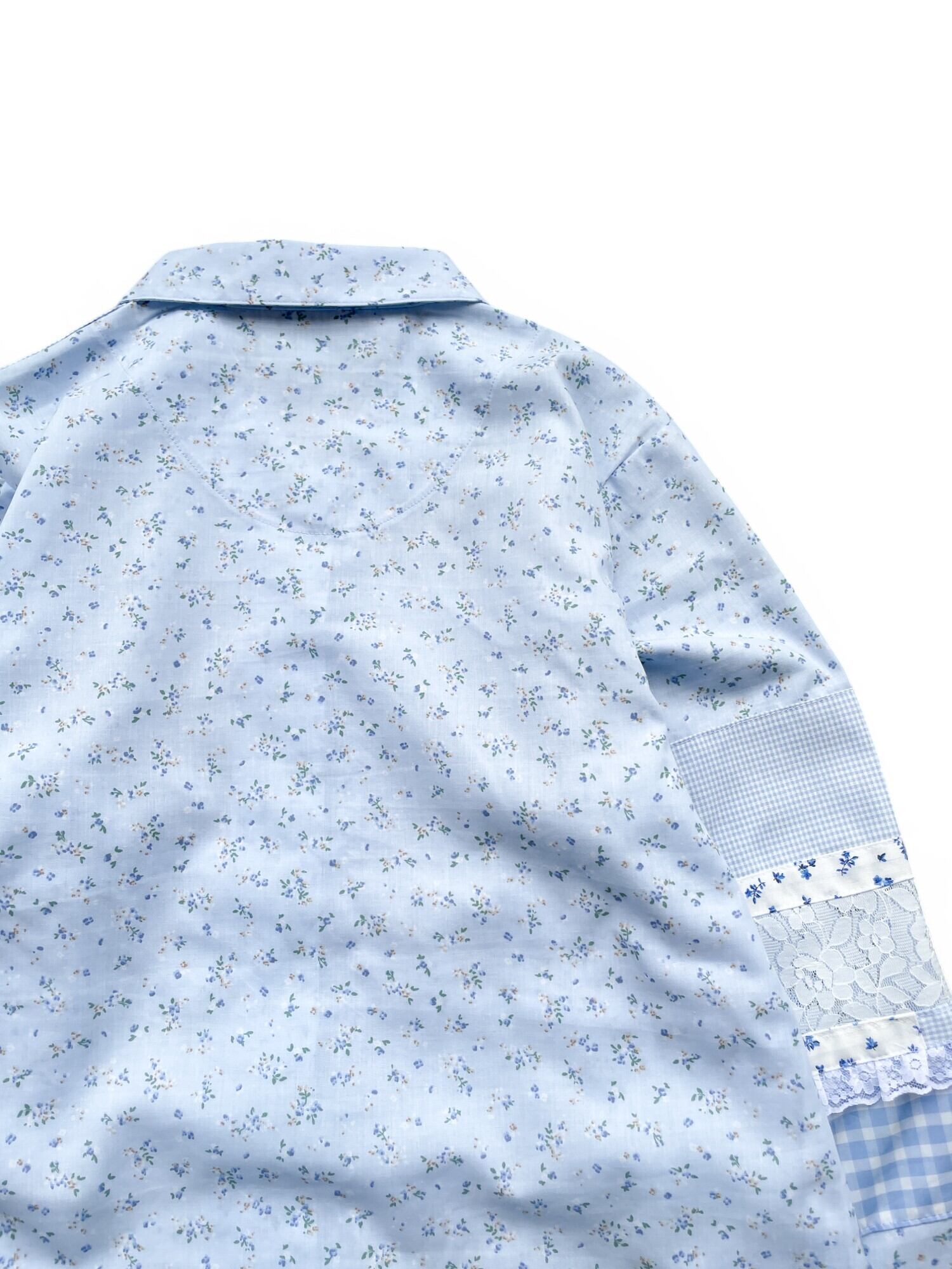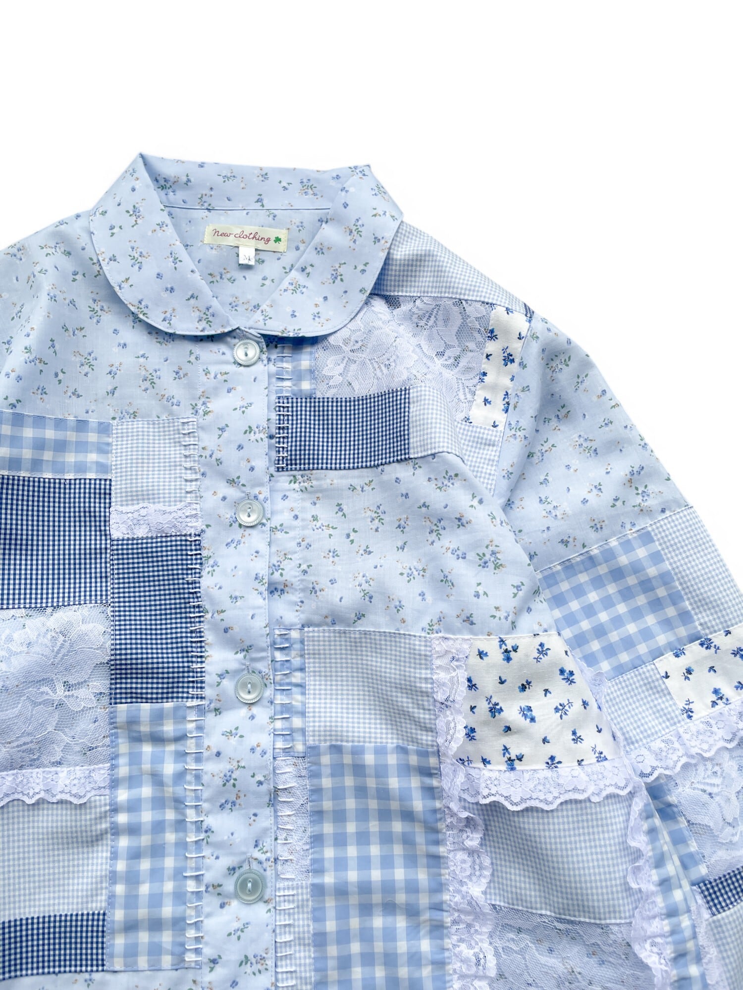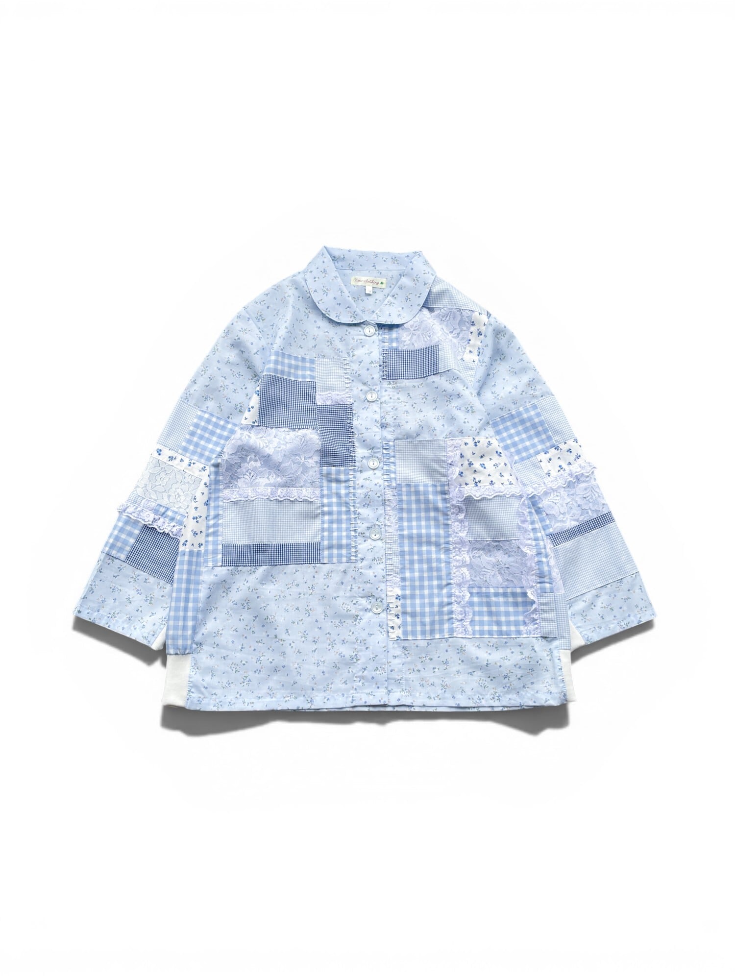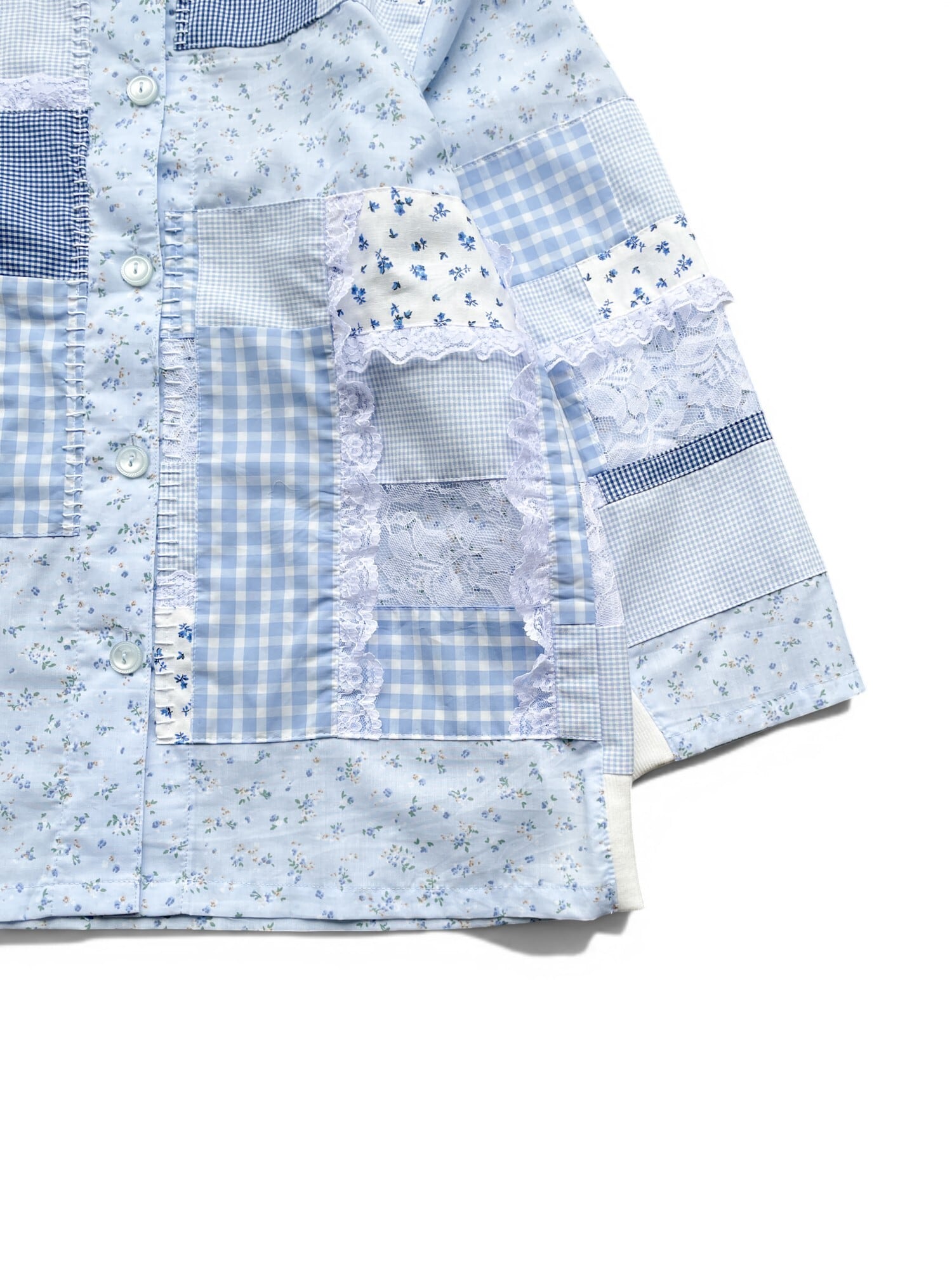 花柄のパジャマシャツに花柄、ギンガムチェック、レース生地をパッチワークして縫い付けました。所々にレースと手縫いのステッチでアクセントを付けています。