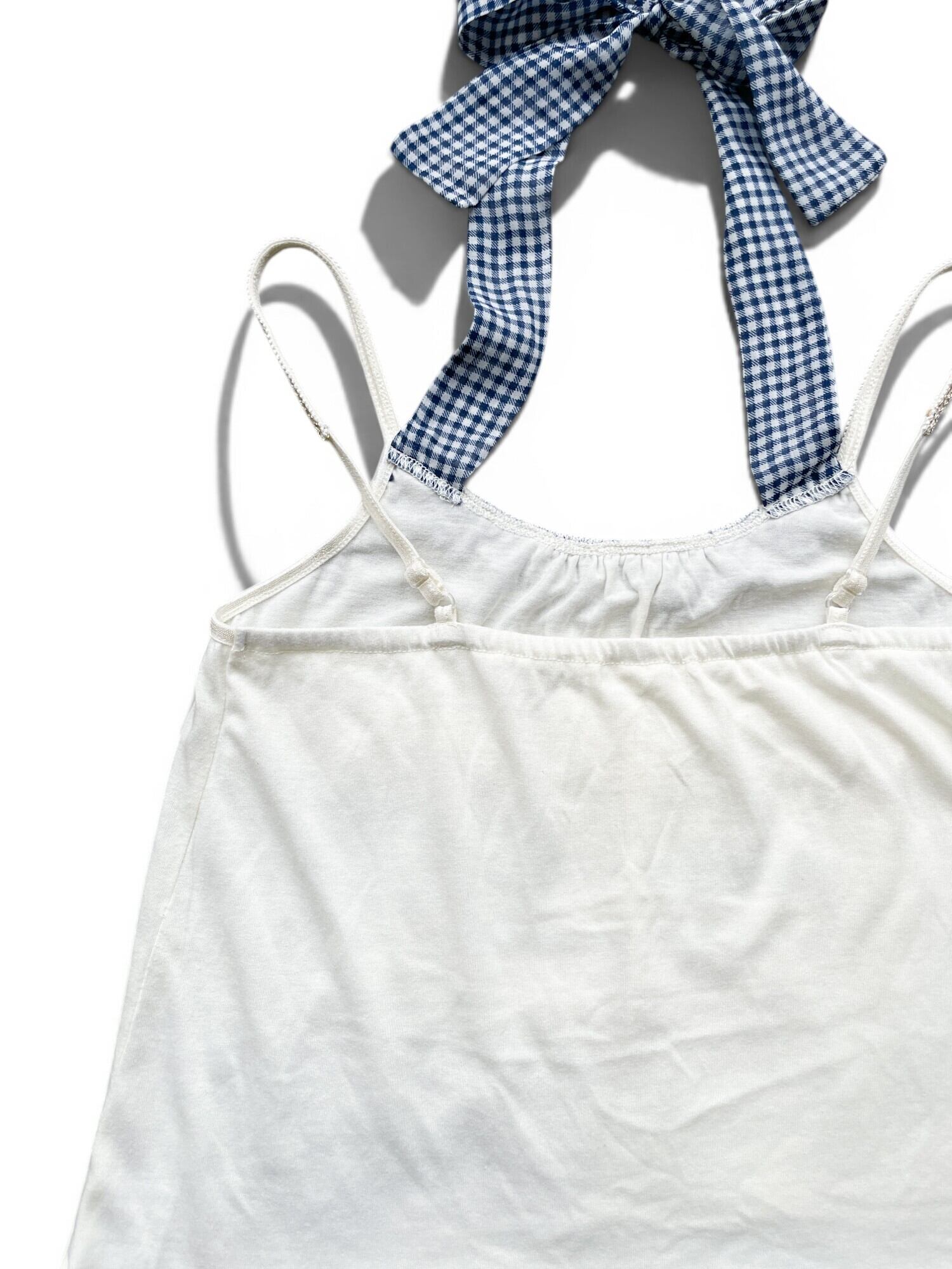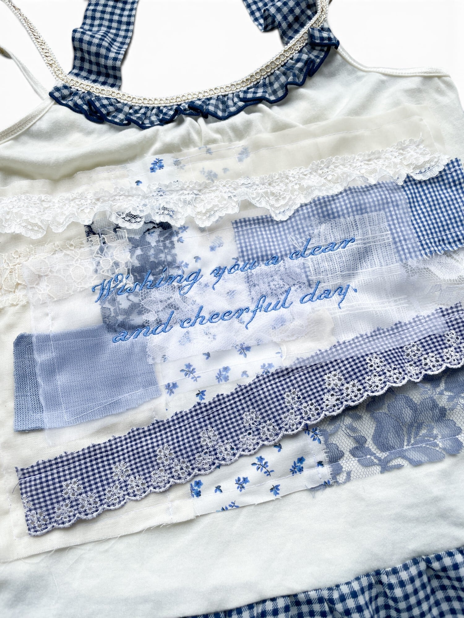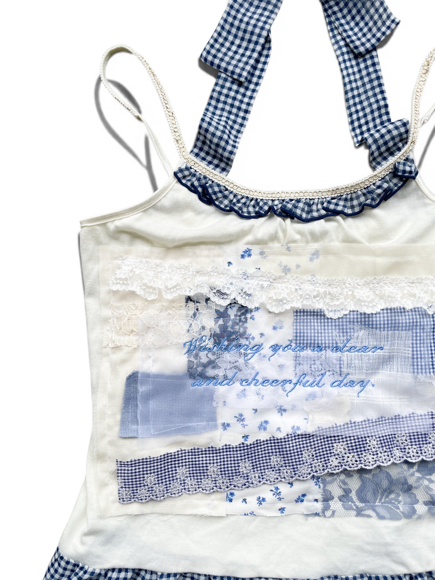 ホルターネックつきキャミソールにレース、ガーゼ、ギンガムチェックの生地をコラージュして上から刺繍をしました。