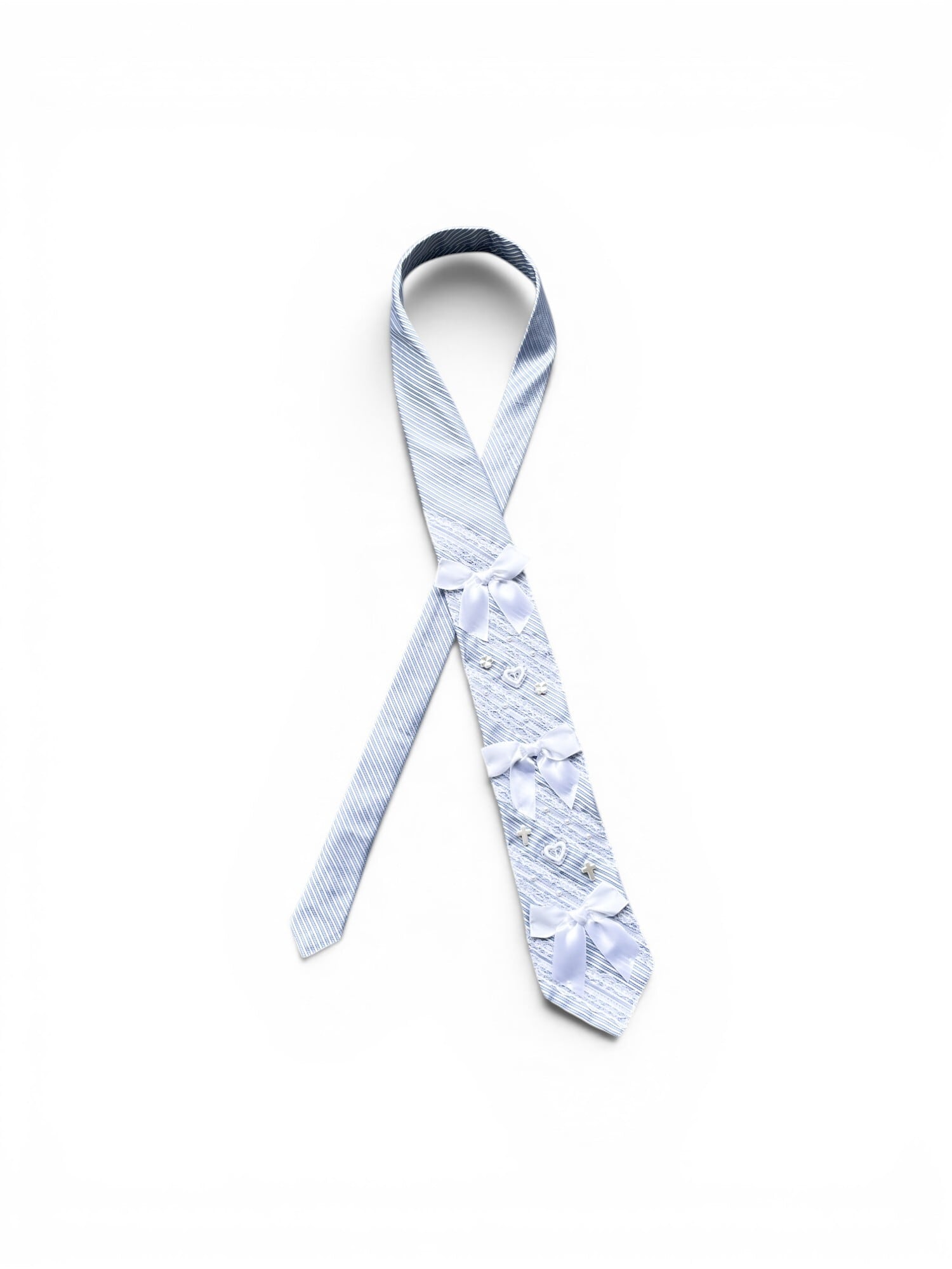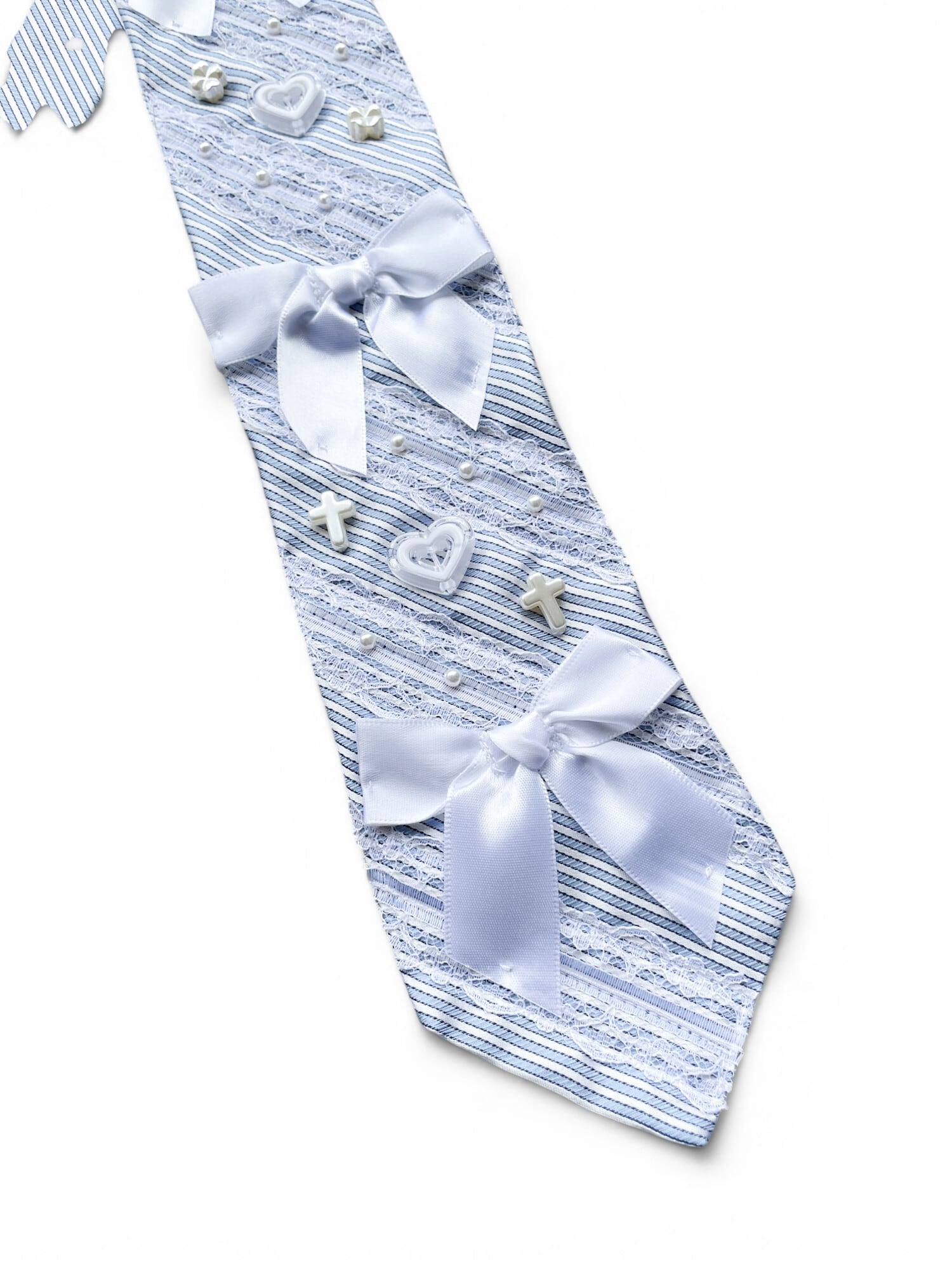 サックスブルーのネクタイをビーズ、リボン、レースでカスタムしました。